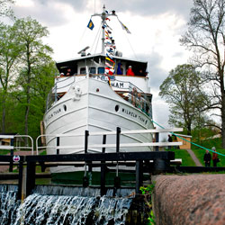 På Stora Sverigeresan från Stockholm lägger båten till för natten vid nedersta slussen.