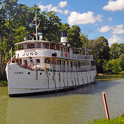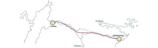 Vi färdas utan slussning 20 km genom den vackra Östgötanaturen och passerar två akvedukter, åtta broar, Brunneby ägor och Ljungs slott (Axel von Fersen d.ä.)
