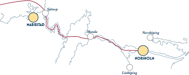 Slussen i Norsholm reglerar nivån i Roxen. Här korsas kanalen av järnvägslinjen mellan Stockholm och Malmö. Kryssningen Göta kanals pärlor med M/S Wilhelm Tham avslutas alternativt påbörjas i Norsholm.