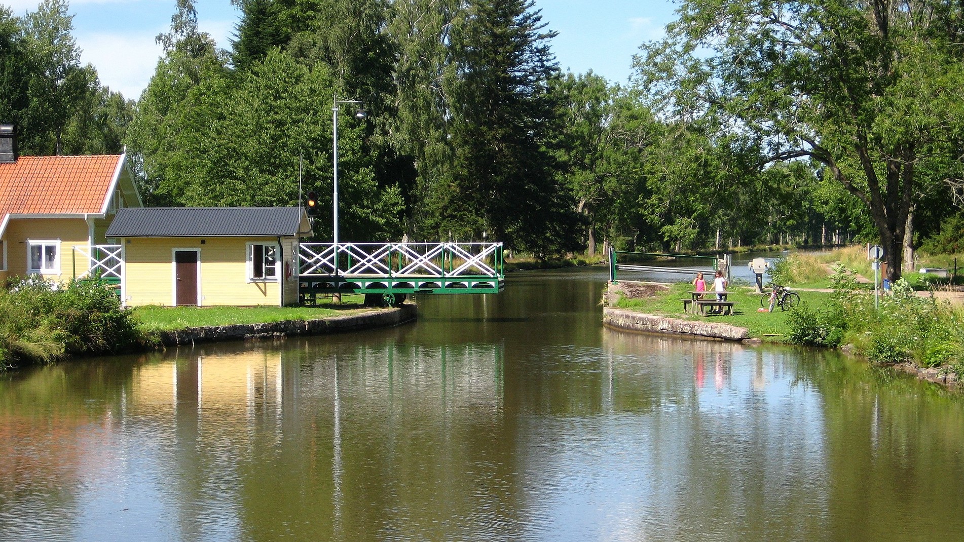 Vid Tåtorp finns en av Göta kanals två bevarade handmanövrerade slussar.