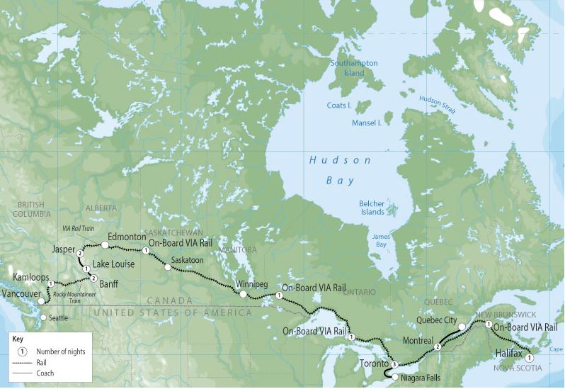Oneway tour from Halifax to Vancouver travelling through dynamic landscapes from coast to coast